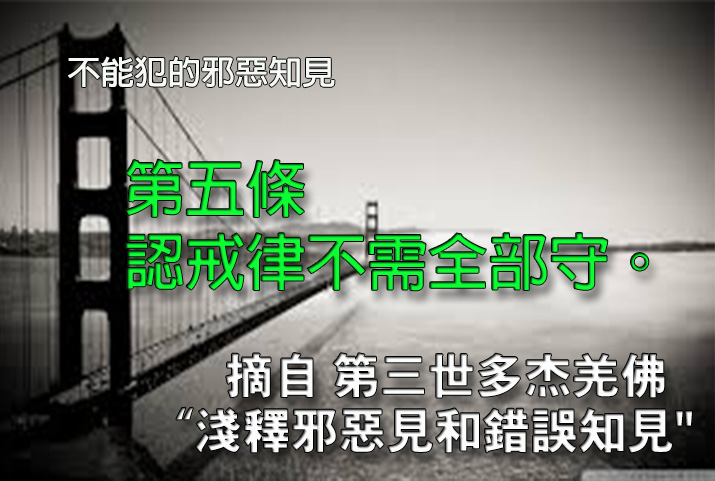 <br><div class="separator" style="clear: both; text-align: center;"><a href="https://1.bp.blogspot.com/-gcfGhnK62Qk/V4NcmgOPK-I/AAAAAAAAAFk/mvq0a18hFsoppz_TicPM884o00OCB-Z7ACKgB/s1600/05_%25E7%25AC%25AC%25E4%25BA%2594%25E6%25A2%259D%25EF%25BC%258C%25E8%25AA%258D%25E6%2588%2592%25E5%25BE%258B%25E4%25B8%258D%25E9%259C%2580%25E5%2585%25A8%25E9%2583%25A8%25E5%25AE%2588%25E3%2580%2582.jpg" imageanchor="1" style="margin-left: 1em; margin-right: 1em;"><img alt="第三世多杰羌佛 說法 「淺釋邪惡見和錯誤知見」第五條" border="0" height="430" src="https://1.bp.blogspot.com/-gcfGhnK62Qk/V4NcmgOPK-I/AAAAAAAAAFk/mvq0a18hFsoppz_TicPM884o00OCB-Z7ACKgB/s640/05_%25E7%25AC%25AC%25E4%25BA%2594%25E6%25A2%259D%25EF%25BC%258C%25E8%25AA%258D%25E6%2588%2592%25E5%25BE%258B%25E4%25B8%258D%25E9%259C%2580%25E5%2585%25A8%25E9%2583%25A8%25E5%25AE%2588%25E3%2580%2582.jpg" title="第三世多杰羌佛 說法 「淺釋邪惡見和錯誤知見」第五條" width="640"></a></div><span style="font-size: large;"><b><br></b></span><span style="font-size: large;"><b>第五條:認戒律不需全部守</b></span><br><span style="font-size: large;"><br></span><span style="font-size: large;">只要你受了某個戒,就得不折不扣的守,每一條都得守,不能認為只守其中一條或部分戒條,某些戒條可以不守。只要認為戒律可以不必全部守,此理念不僅是邪,而且是惡。</span><br><span style="font-size: large;"><br></span><span style="font-size: x-large;">更多文章分享:<a href="http://www.hkfhh.com/" target="_blank">福慧行</a></span><br><div><br></div>